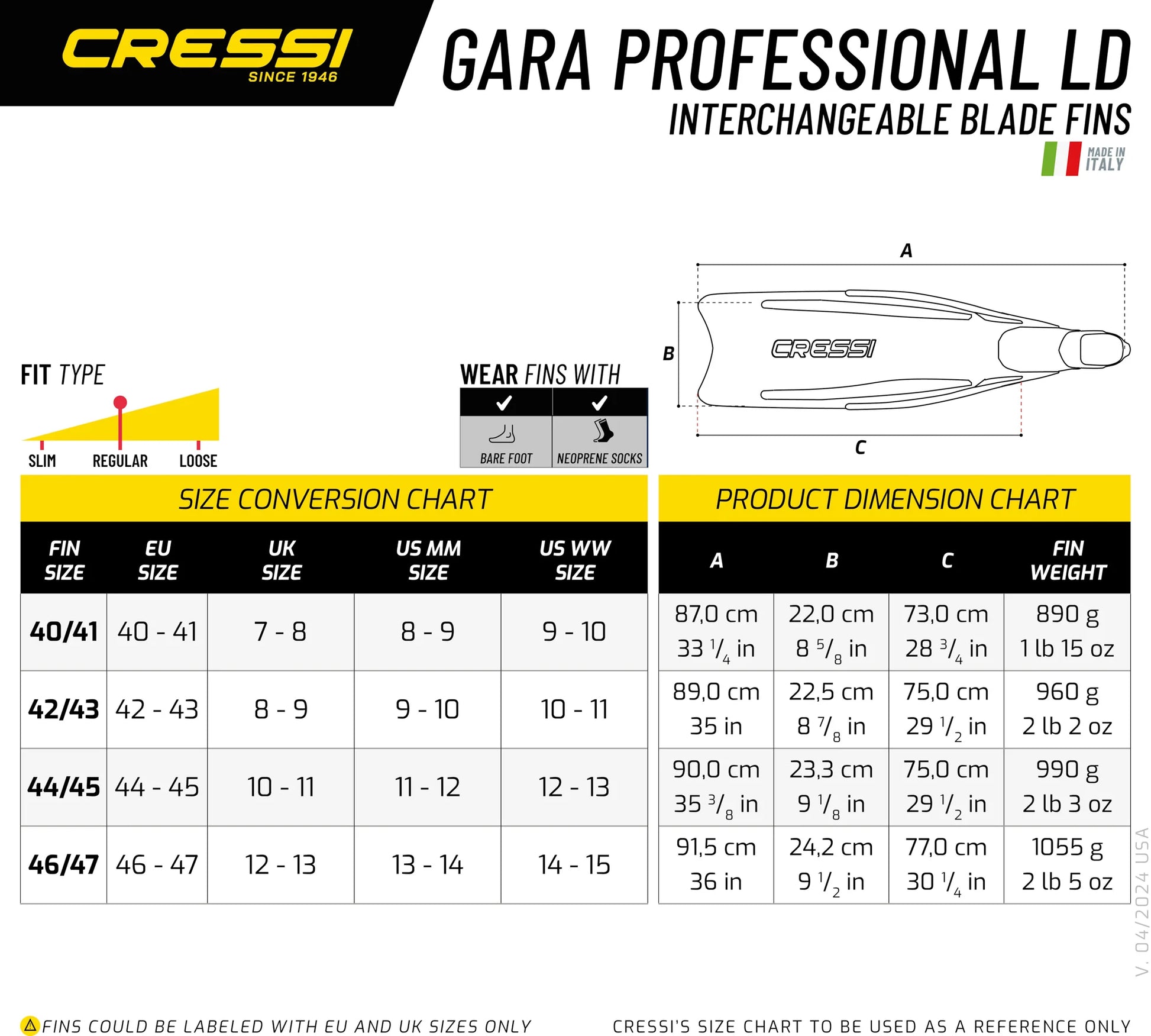 Following the great success of the Gara Professional, Cressi has also thought of those who wish to benefit from all the winning characteristics of the Gara Professional, without having the muscles of an athlete that is trained to full capacity. The blade is made from a special elastomer polypropylene which gives a longer lasting, more fluid, softer kick that is less demanding, making it ideal for covering long distances. The use of this new engineering plastic is less reactive and nervous than the Compoflex used in the Gara Professional. It guarantees progressive and well controlled blade flexibility which gives an extremely fluid kick. Together with the exceptional lightness and no dispersion of effort, the kick is more effective and pleasant than ever. Like the other Gara fins (2000 HP – 3000 LD – Gara Professional) in the Cressi range, the Gara Professional LD also boasts an industrial production process that guarantees very high standards of precision and response to strict technical parameters that are impossible to obtain with traditional craftsmen's techniques. The new shoe pocket on the Gara Professional LD has been designed so that it is positioned under the actual blade. This characteristic, together with a perfect union between blade and foot, contributes to reducing effort and energy dispersion as much as possible during the kick. The anatomy of the foot pocket has been re-designed and, if possible, further improved compared to the already much appreciated shoe pockets of the Cressi Gara. The use of a new, particularly soft elastomer further increases comfort. Who they are for: The new Gara Professional LD are for all those divers who wish to benefit from the extraordinary performance of Cressi long fins, without, on the other hand, having to use too much muscular effort. For those divers who have not undergone excessive training, the ideal effort-productivity ratio can offer even higher performance than when using the more rigid and reactive Gara Professional. Perfect for long kicks and for cold water, but also ideal for use with breathing apparatus, where their exceptional propulsion qualities will astound.
