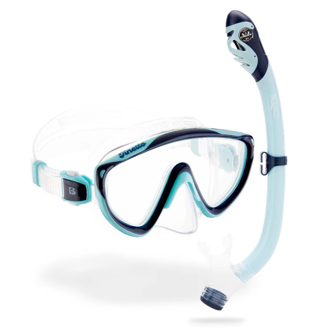 The Tinetto & Iguana Dry combo is a reliable and lightweight combo for young snorkelers. The Tinetto is a single lens mask with tempered glass to create a clear snorkeling experiencing. There are adjustable buckles on the sides, which makes it easier to adjust the length of the strap. Thanks to the silicone skirt and split head strap, there is a guarantee of a perfect seal and comfortable fit. The Iguana Dry snorkel contains a dry top valve system, which seals the tube when submerged in water to prevent water entry. The snorkel come with a snorkel keeper to clip the snorkel to the mask. The mouthpiece is made from silicone to prevent jaw fatigue. There is a bottom purge valve used to easily eject water from the snorkel.