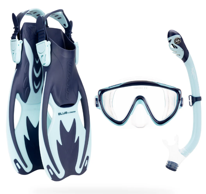 The Tinetto Rocks Dry Set is a snorkeling set for young kid snorkelers eager to explore marine life. The Tinetto is a single lens mask with tempered glass to create a clear snorkeling experiencing. There are adjustable buckles on the sides, which makes it easier to adjust the length of the strap. Thanks to the silicone skirt and split head strap, there is a guarantee of a perfect seal and comfortable fit. The Iguana Dry snorkel contains a dry top valve system, which seals the tube when submerged in water to prevent water entry. The snorkel come with a snorkel keeper to clip the snorkel to the mask. The mouthpiece is made from silicone to prevent jaw fatigue. There is a bottom purge valve used to easily eject water from the snorkel. The Rocks fins are designed with dual composite vented blades to reduce fatigue and leg cramps. The foot pockets are made of rubber to ensure a comfortable fit. The buckles can be easily adjusted by a press of a button, which adjusts the strap length. The fins' strap includes a thumb loop to facilitate the easy removal and putting on of the fin. The loop can also be used to hang the fins on a hook for display.